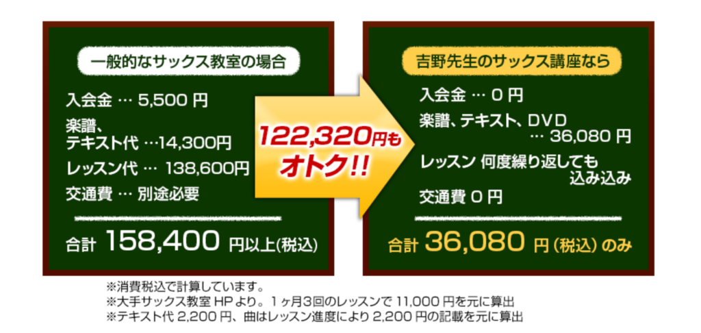 こちらの吉野先生の教材には38回分のレッスン内容が盛り込まれています。一般的なサックス教室に通った場合の費用と比べてみましょう。